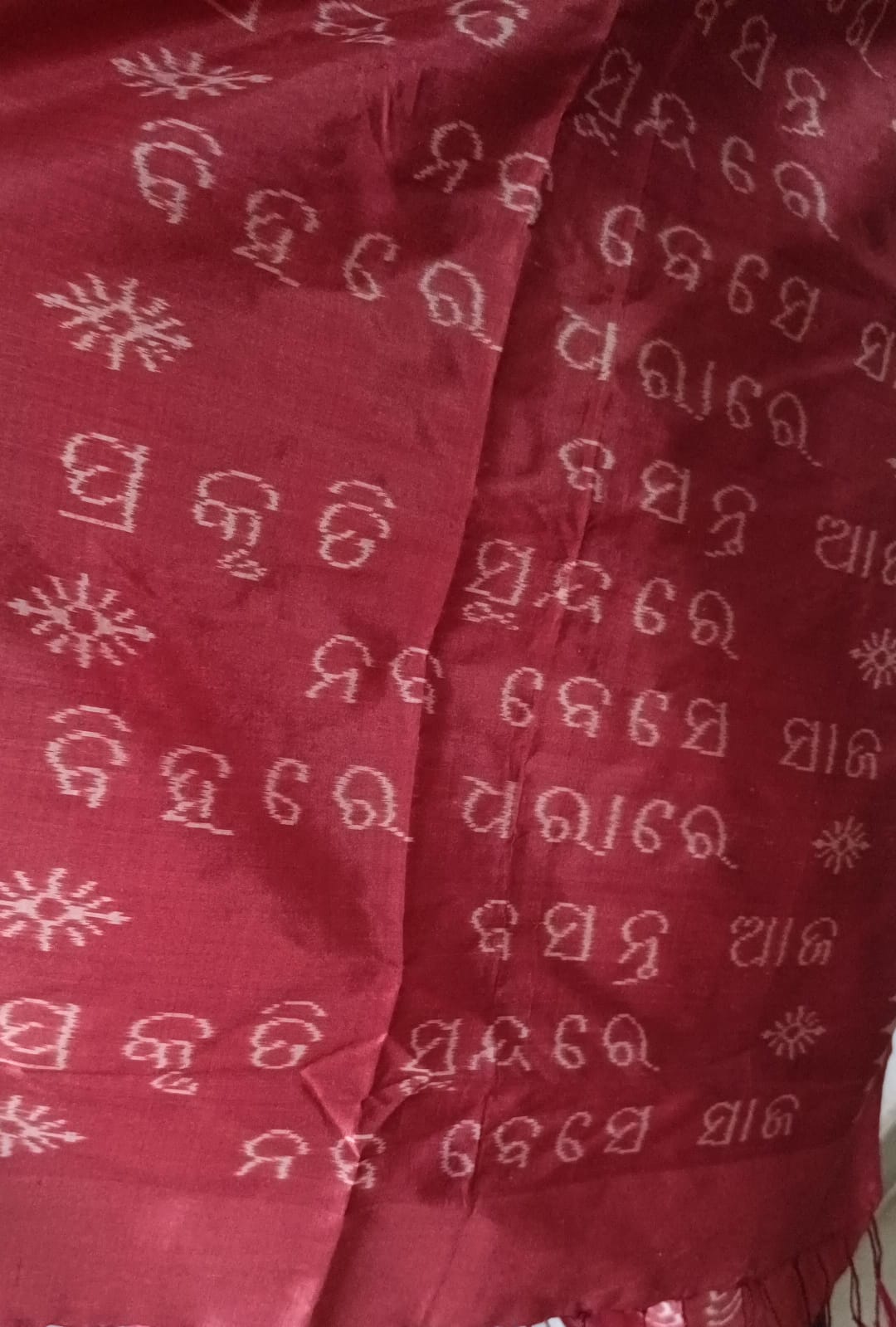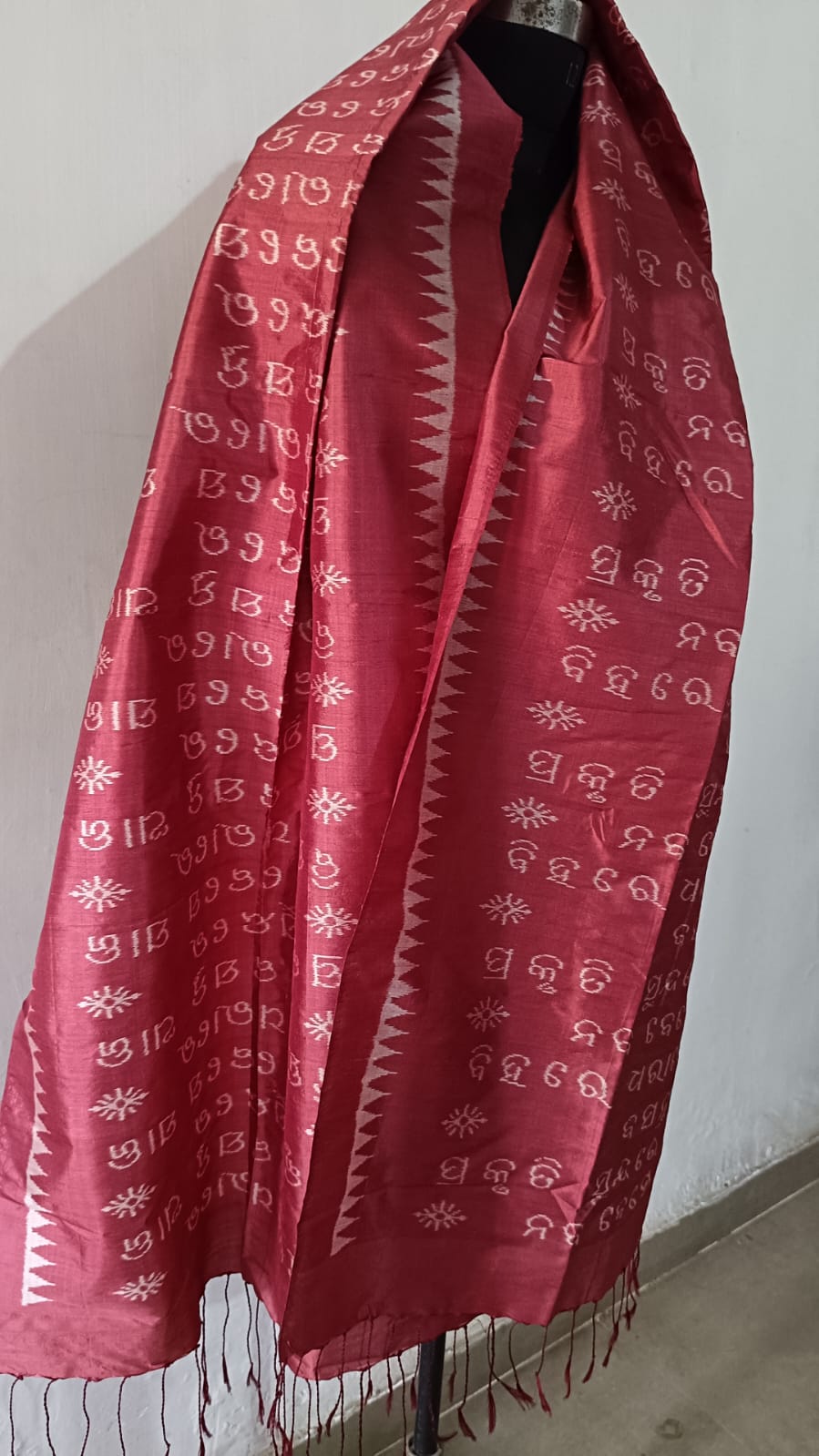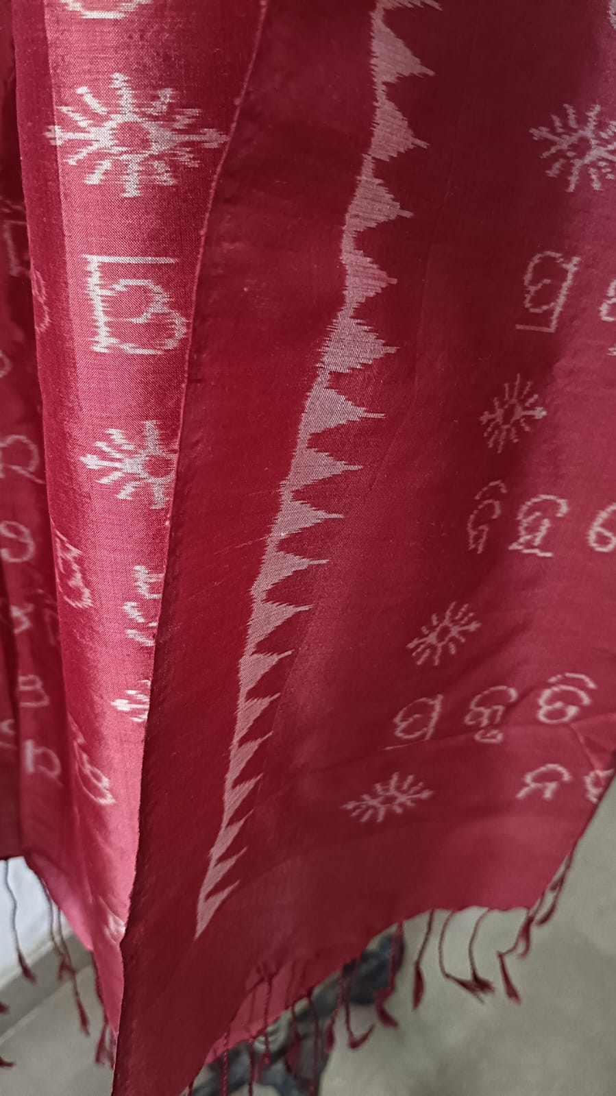 Product: hand woven ikat tussar stole L x W: Price: 12000/- Color: maroon (lac) vegetable dyed