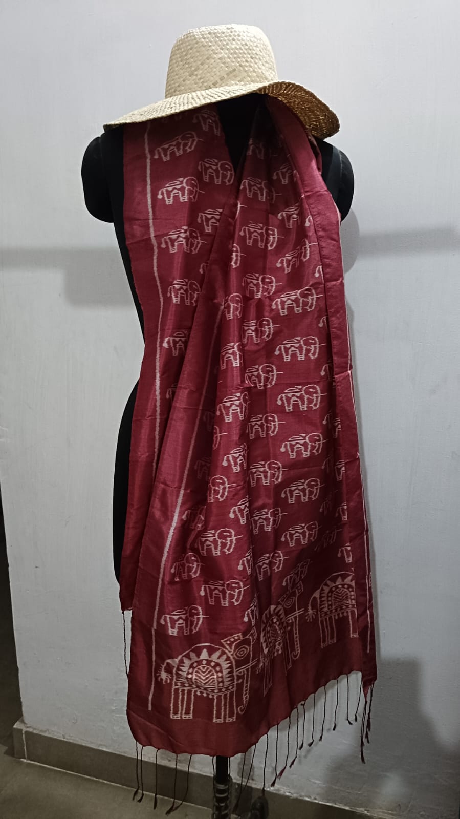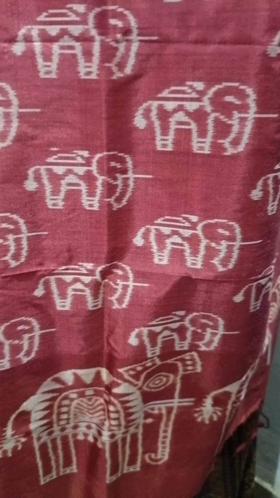 Product: tussar silk stole L x w : Color : maroon ( lac ) vegetable dyed Price: 12000/- Care: drycleaning / sope nut wash Weave : Hand woven ikat As photographed the colour of the product may vary for lighting purpose
